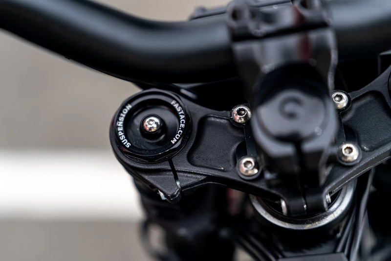 -Suspensie fata: FASTACE, furca double crown pneumatică, cu reglaj